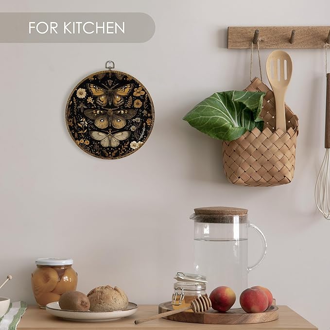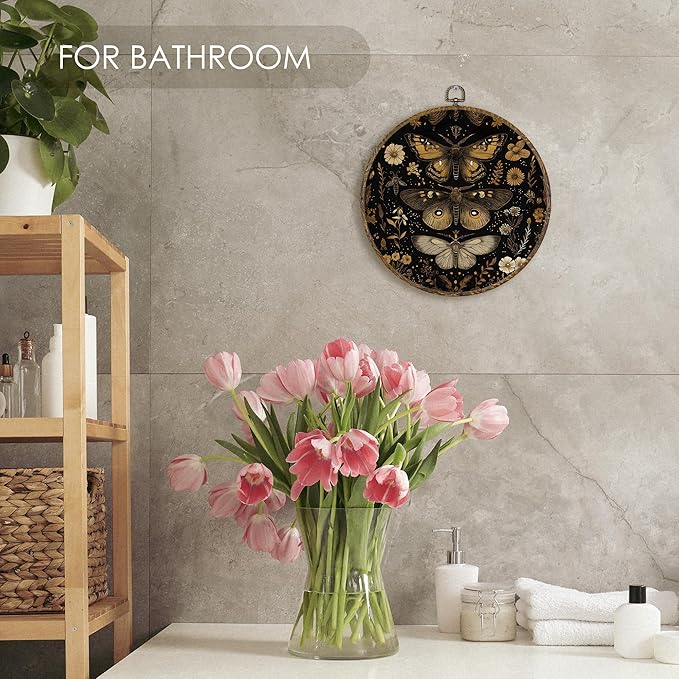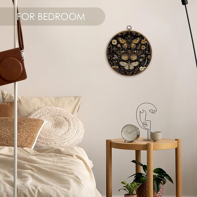 Fewgb Black Gothic Moth Round Wall Art Decor Framed for Gallery Bedroom Living Room Bathroom, Dark Witchy Butterfly Flower Canvas Wall Art Prints Picture, Moody Floral Hanging Room Decor Artwork 10x10