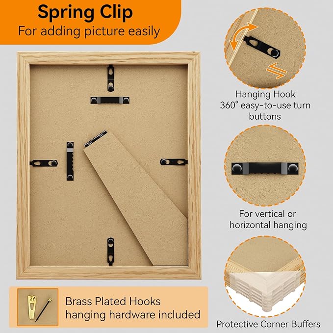 - VERSATILE DISPLAY: Sturdy backboard and versatile hooks allow for horizontal or vertical placement, whether decorating a desk or hanging on a living room wall, it creates a cozy atmosphere. Our natural oak poster frames to display your pictures, posters, diplomas and crafts for a stylish home decor.
