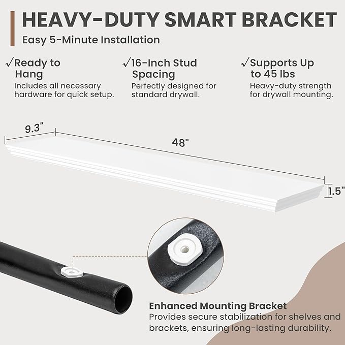 - Strong Suppoot: MDF wooden floating shelf with reinforced brackets supports heavy items effortlessly, holding up to 45 pounds. Hanging shelf's bracket has been preset with a 2° elevation to remain level and not sag after bearing heavy loads