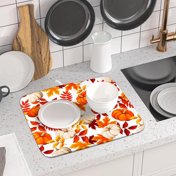 - 【Absorbent】The fall pumpkin dish drying mat is a 3-ply design made of absorbent microfiber, composite sponge, and cotton sateen fabric, the dish drying pad absorbs 4X its weight in water. Perfect for air-drying dishes, glasses, pots, pans, bottles, fruits, and vegetables.