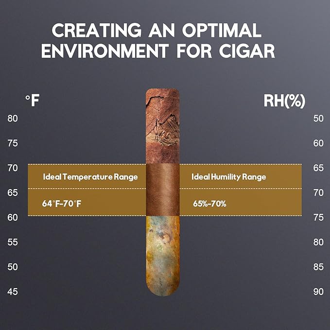 - 【Synchronized Temperature and Humidity Control】Our cigar humidor cabinet features LED touch screen panels with digital thermometer and hygrometer for intelligent control and faster response time. The temperature control range is 59-72°F (15-22°C), the humidity control range is 60%-75%, Fahrenheit / Celsius one-touch switch. Built-in large-capacity water tank with thickened sponge, no need to refill water frequently. 360° frost-free air-cooling technology keeps the temperature and humidity constant at every location inside the box, promoting cigar aging and maturation.