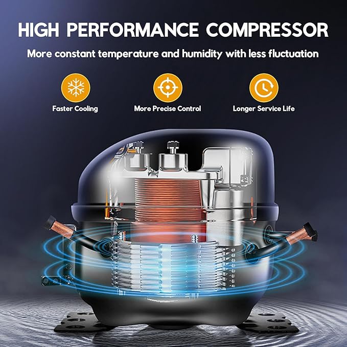 - 【Silent Compressor Cooling& 546 Cigar Capacity】Using silent compressor refrigeration technology, compared with semiconductor refrigeration, the compressor service life is increased by 30%, refrigeration speed is increased by 40%, temperature and humidity fluctuation ≤1, noise ≤ 35dB, no vibration, so you can enjoy life without worry. Front air outlet and 4 adjustable non-slip feet, which can be built-in or under-counter. The electric humidors for cigars have a capacity of up to 88L and can hold up to 546 cigars (depending on ring gauge). It is equipped with a safety lock to ensure the security of your precious collection.