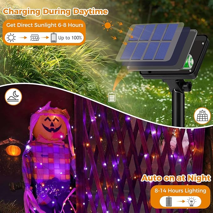 - 2 Packs Solar Halloween Lights Outdoor: Each Ultra-Bright fairy lights solar with 80 LED 33 FT (26.5 ft light string +6.5 ft lead wire), total 160 LED with orange & purple light beads, emitting a Spooky and wonderful light, creating an atmosphere of mystery and horror for Halloween party