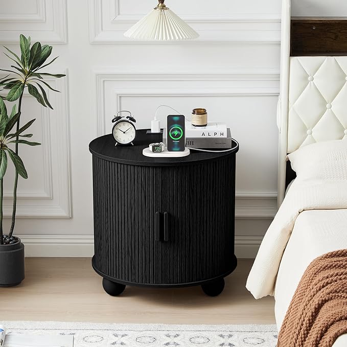 AVZEAR 24" Large Round End Table with Charging Station, Farmhouse Fluted Sofa Side Table with Sliding Tambour Door & Storage, Mid-Century Wood Nightstand for Living Room, Bedroom, Black
