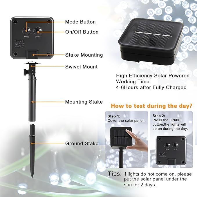 - 【Advanced Monocrystalline Silicon & IP65 Waterproof Level】Solar lights outdoor use more advanced monocrystalline silicon solar panels, which can receive, store and release solar energy more efficiently, and the solar energy conversion rate has increased by 21%. This means charging time is only 5-6 hours and battery life is up to 10-12 hours. The solar string lights outdoor waterproof up to IP65 waterproof rating, no need to fear any weather!