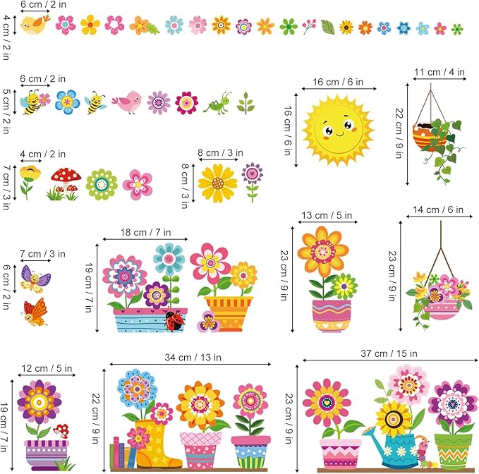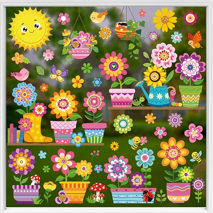 decalmile Spring Summer Kids Multicolor Flower Double Sided Window Clings Colorful Floral Garden Potted Sun Anti-Collision Glass Doors Window Stickers Decals