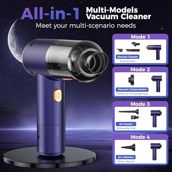 - 【Versatile Attachments for Multi-Surface Cleaning】Cordless vacuum cleaner Includes 7 specialized accessories which can be used for suction, blowing, inflation, and compression, catering to various cleaning needs around the home and car. Including flat nozzle for narrow gaps (e.g., air vents, seat tracks), soft bristle brush for delicate surfaces (dashboards, fabric seats). Air duster and inflation nozzle for daily use. And vacuum compression for storage.