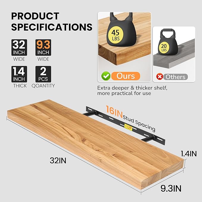 Floating Shelves for Wall, 32"W x 9.3"D x 1.5"H Rustic Solid Elm Wood Wall Shelves, Set of 2 with Invisible Heavy-Duty Metal Bracket, Deep Floating Shelf for Living Room Kitchen, Natural