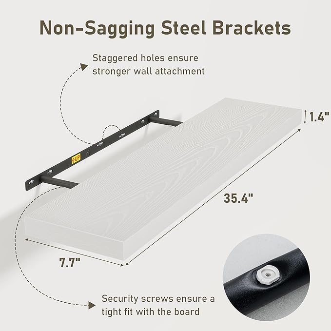 - 36 Inch Floating Shelves for Wall (Set of 2): Each wall shelves are 8 inches in depth and 1.4 inches in thickness. 2-piece set is more cost-effective and practical. Our wall shelf can be used in combination, staggered high or low on the wall, or mounted side-by-side to provide extra storage space for organizing small items and clutter in multiple areas such as kitchens, bathrooms, and bedrooms, creating a clean and smooth look. Multiple colors available