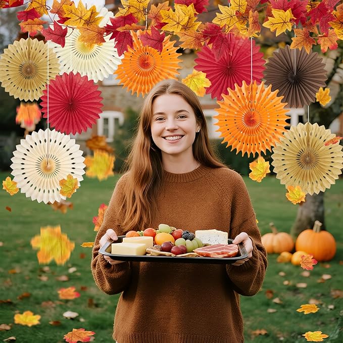 - Complete 110-Piece Fall Decor Set – This value-packed set includes 9 paper fans, 100 artificial maple leaves, and 1 fall leaf garland (6.6 feet long)—everything you need to bring cozy autumn vibes to your home or event.