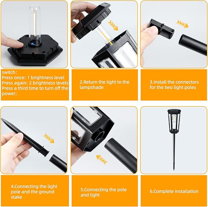 - ๐ใTwo-In-One Modeใ: Our solar garden lights are upgraded, with 2 on the basis of warm color light to adjust the brightness. You can decorate the scene according to your needs. Place these solar path lights near pergolas, ponds, or fire pits for a stunning outdoor display๏ผNote: To avoid the sensor thinking that it has not reached the start of dawn, please do not install the solar path light in an environment with very bright light.๏ผ