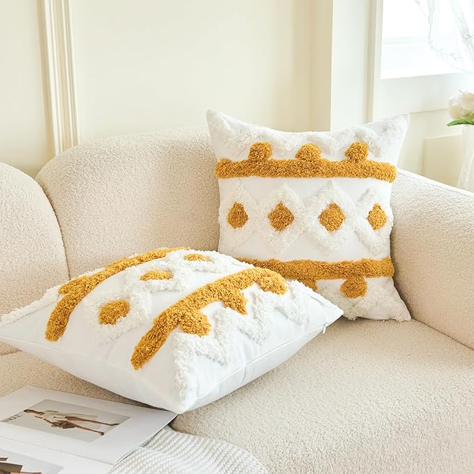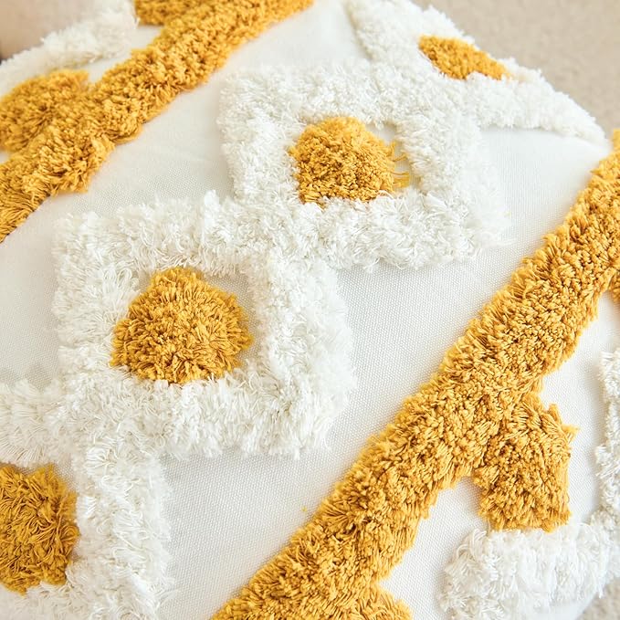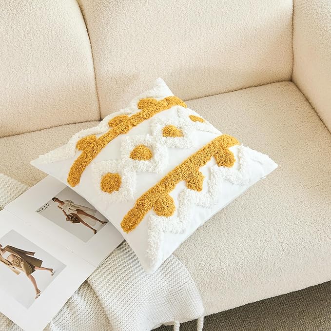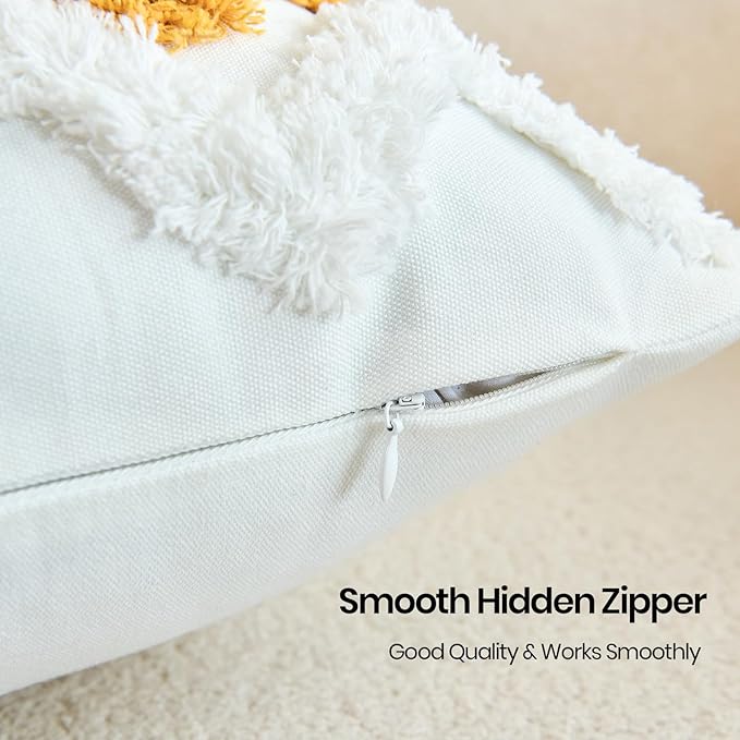 - ⭐【FABRIC AND SIZE】The front of this boho couch pillow cover is made of 100% polyester + 10% viscose,the backside is made of 100% cotton.Measures 18x18 inches.Exquisite workmanship enables tufting part dense soft and aesthetic.The 3D effect with the tufting technic makes these abstract pillow covers so distinctive
