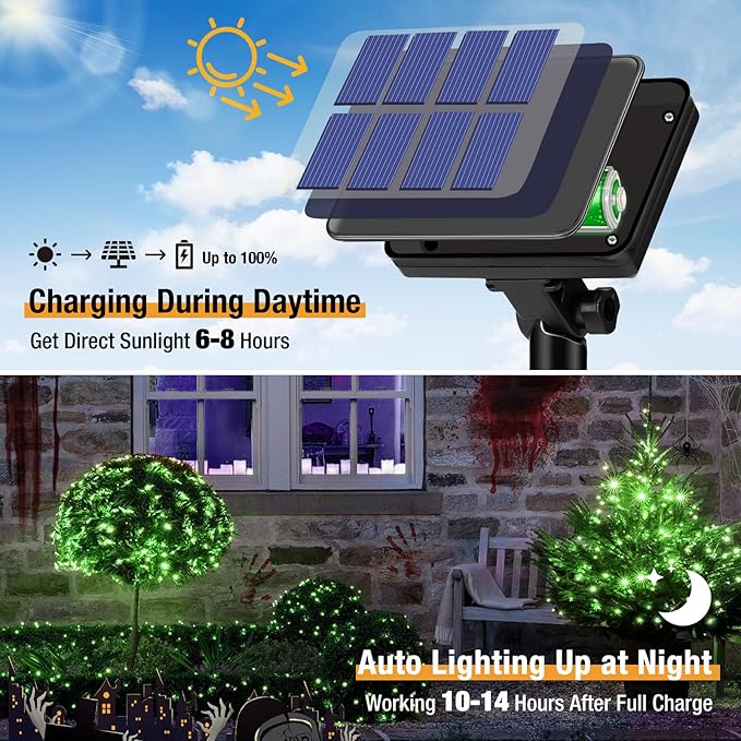 - 2 Packs Solar Halloween Lights Outdoor: Each Ultra-Bright fairy lights solar with 80 LED 33 FT (26.5 ft light string +6.5 ft lead wire), total 160 LED with green light beads, emitting a Spooky and wonderful light, creating an atmosphere of mystery and horror for Halloween party