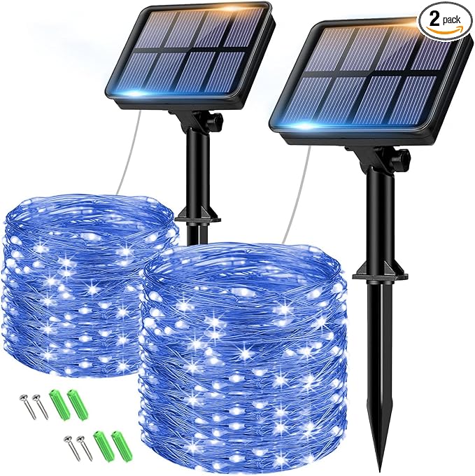 - Waterproof Design for All Weather: Light string and solar panel are IP65 waterproof to withstand any weather, either rain, sun, or snow. Safe for outdoor use, Don't worry about short circuits or bad weather damage (can't soak in water). Emit a magical blue lights after rain, romantic and beautify the yard