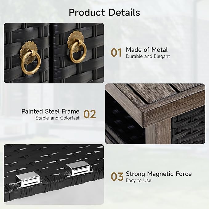 - Weatherproof Materials: Rain or shine, this patio cabinet stays elegant! Handwoven PE rattan brings nice texture that resists cracking, paired with a painted steel frame that resist rust and sunburn. Whether on a sunny patio or in a humid environment, rotting and fading are no more. Tough enough for outdoors, chic enough for indoors!