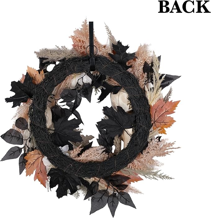 - SEASONAL DESIGN: Stunning Halloween wreath featuring realistic skulls, pampas grass, and a mix of black and orange autumn leaves for a perfect spooky yet sophisticated door decoration