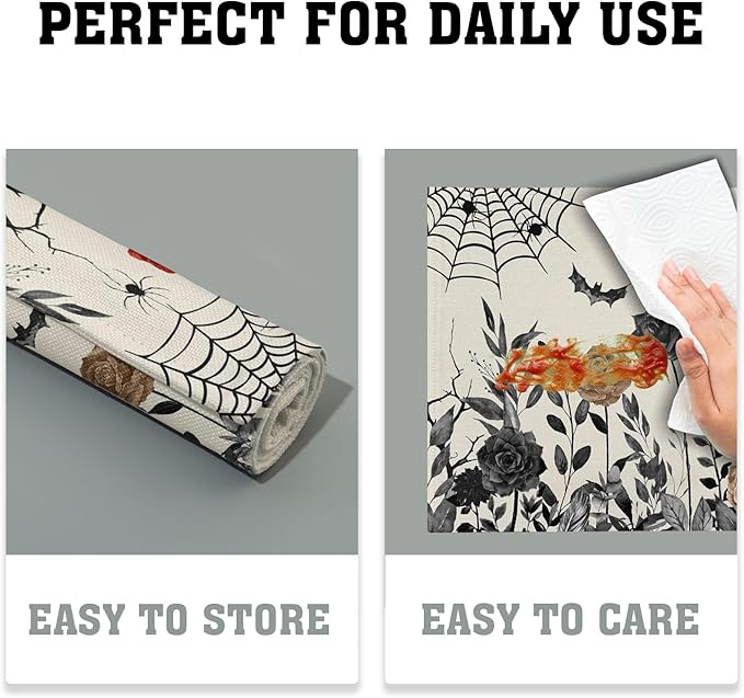 - Easy Care: Black vintage halloween placemats can be washed by hand or machine, or wiped clean with a damp cloth. If there are stains on placemats, give them a quick wash and you can use them again, effectively extending the life of your dining table
