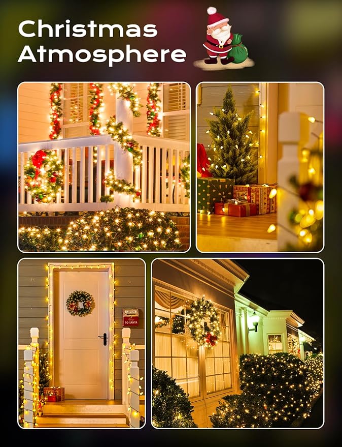 - [IP65 Waterproof] Sturdy plastic housing, waterproof plastic strip, enable the christmas lights to prevent rain and water from entering effectively. Perfect for indoors and outdoors christmas decoration, such aspatio railing, front door, house eaves, front porch, gazebo canopy, backyard, balcony railing, outside front window, front deck railing, front yard, Christmas tree etc