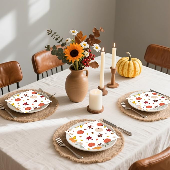 - ๐ฝPackage Includes: This package contains 50 pieces of fall-themed paper luncheon napkins. The elegant autumn patterns, featuring pumpkins and leaves, bring a festive touch to your gatherings while providing ample quantity for your needs.