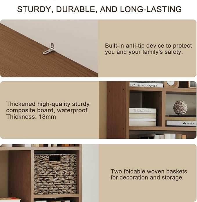 - Smart Storage Solution – The unique backless design with 16 irregularly arranged cubes (6 tiers total) offers versatile storage options, perfect for books, decor, and the included 2 premium foldable woven baskets that add both functionality and style.