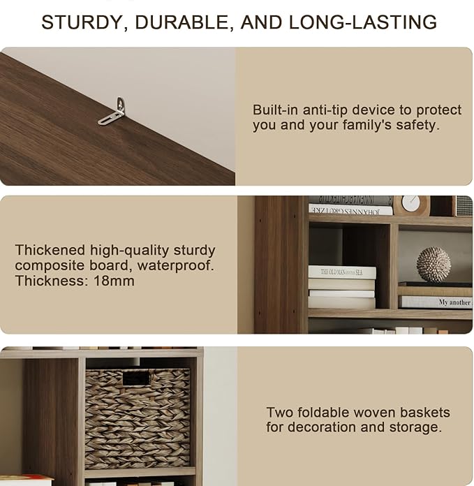 - Smart Storage Solution - The unique backless design with 16 irregularly arranged cubes (6 tiers total) offers versatile storage options, perfect for books, decor, and the included 2 premium foldable woven baskets that add both functionality and style.