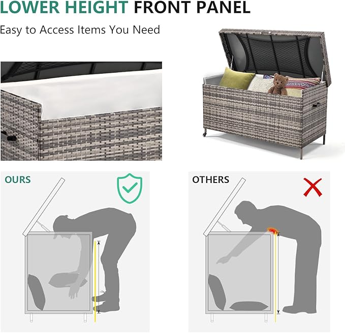 - Reliable & Hassle-Free: This large-capacity outdoor wicker storage box is equipped with high-quality pneumatic devices and sturdy metal hinges, ensuring a stable and smooth opening and closing process. With effortless operation and built-in protection against accidental pinching, it not only prioritizes safety but also makes organization a breeze
