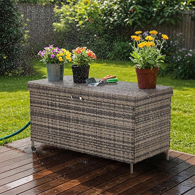 - Handcrafted Wicker Weaving: Our waterproof 240 gallon deck box is made from a selection of uv- and fade-resistant polyethylene rattan, these bins can withstand all weather conditions. To prolong the life of your rattan storage box, we recommend that you keep your storage box indoors when it is raining heavily