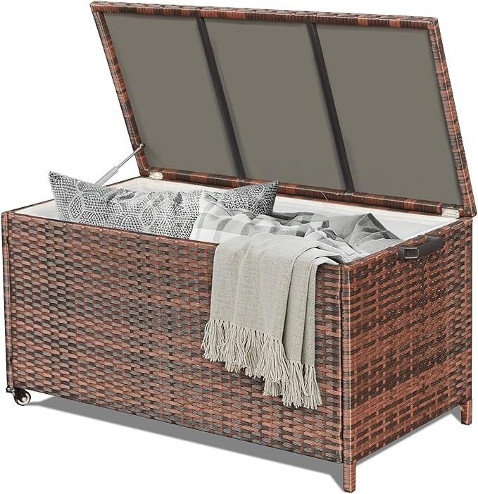 - High-quality Wicker: Crafted from high-quality wicker, this patio deck box is both stylish and durable. It has excellent weather resistance, making it a reliable choice for outdoor use. The cover of this storage bin is weatherproof and UV resistant