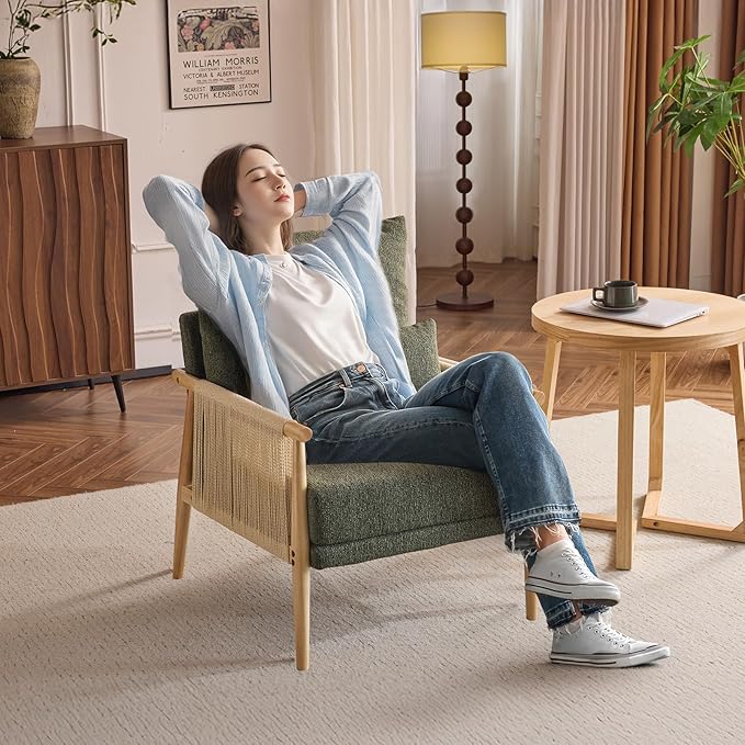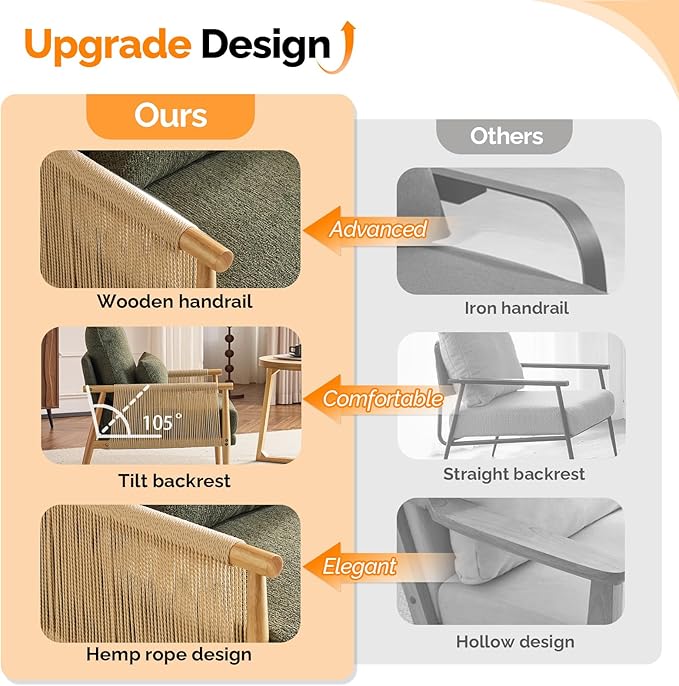 - Braid Design : The Boho-inspired Braid Accent Chair showcases elegant paper cord weaving across its angled armrests. Its thoughtful design combines comfort and style with a medium-height backrest and plush cushioning. This piece seamlessly blends casual and sophisticated interior comfort, perfect for home decoration. The two chairs will be shipped in separate packages. Please note that they may not arrive at the same time.