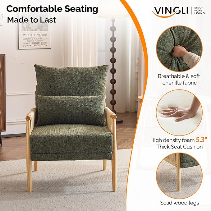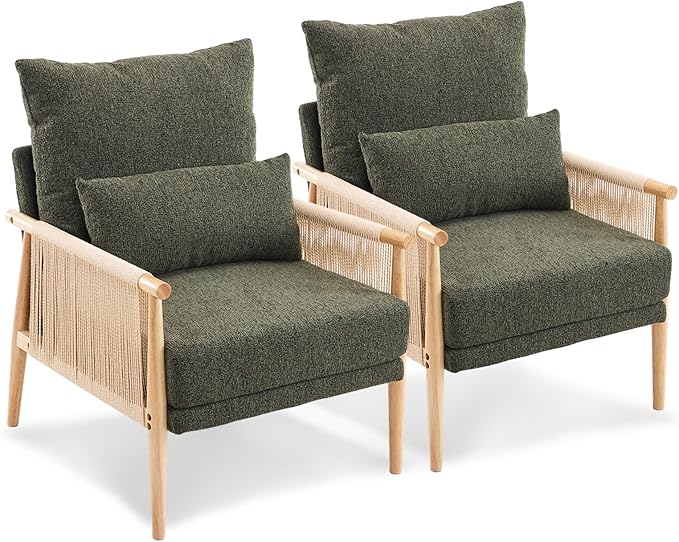 VINGLI Boho Braid Accent Armchairs Set of 2,Mid-Century Modern Chiars with Solid Wooden Armrest,Comfy Louge Cushion Chairs with Waist Pillow for Bedroom,Living Room,Reading Room, Dark Green