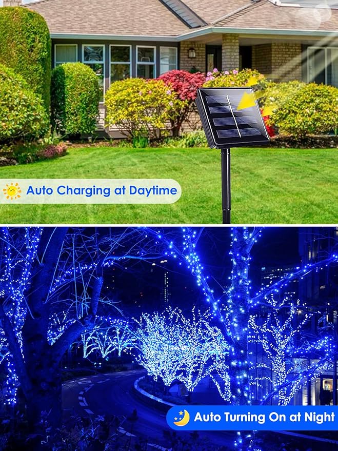 - Unique Blue Solar Twinkle Lights: The solar powered LED string lights outdoor is made with upgraded super bright LEDs, higher solar energy conversion with upgraded solar panel. Green wire matches the color of your Christmas trees perfectly, the warm LED light will bring cozy Xmas atmosphere to your home . Each set contains 4pcs of string lights, each string lights is 33ft long with 100LEDs + 4.9ft leading wire