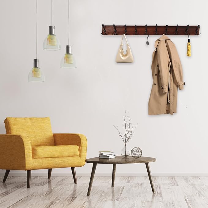 - [Occasion]: Enlarged and lengthened wooden rustic wall mounted coat rack, it is used in farmhouse, entryway, bedroom, living room, cloakroom, mud room, garage, kitchen, laundry room and so on. It worked out great and prevents people from just throwing their things down anywhere.