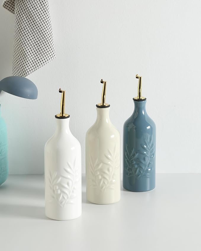 Sweejar Ceramic Olive Oil Dispenser Bottle 20 Oz Relief Opaque Oil Cruet Protects To Reduce Oxidation Suitable for Storage Vinegar, Soy Sauce, Coffee Syrup, Liquids, Set of 1 (Beige Gold Spout)