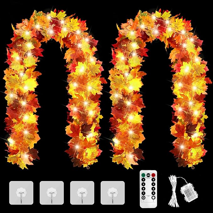 - Package Includes: you will receive 2 autumn maple leaf garlands and 4 convenient hooks, 2 LED string lights (batteries not included) and 1 remote control equipped with button cell batteries, everything you need for effortless, elegant seasonal decoration