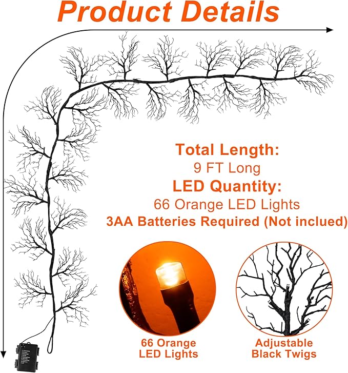 - [ Halloween Willow Vine with Lights ]: Extra Long 9 Ft Realistic Halloween light up garland with 66 orange led lights, total 22 big spooky branches and 66 small spooky branches, Add a touch of spookiness to your Halloween celebrations with our Halloween garland lights, perfect for spooky black Halloween decorations