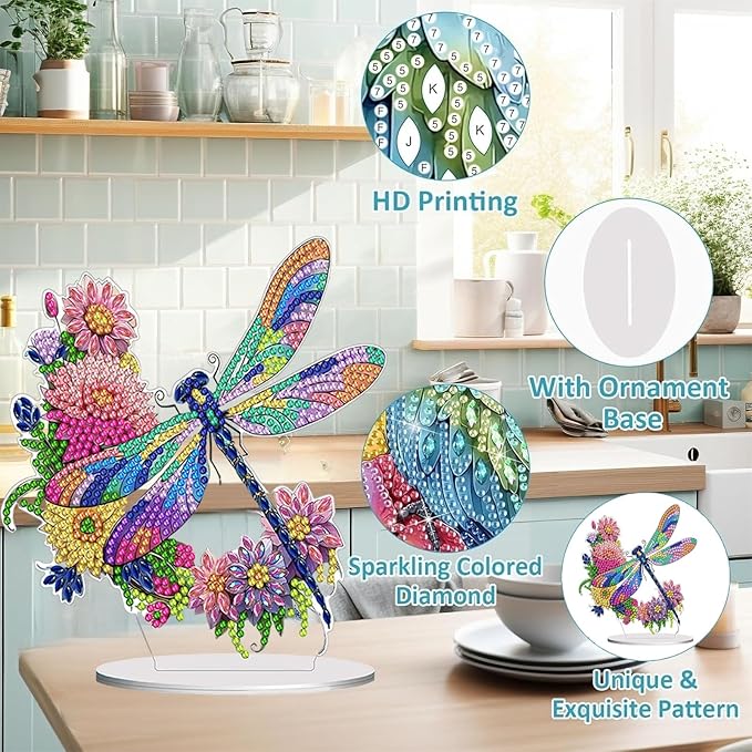 Diamond Painting Kits for Adults Beginners, 5D Full Drill Dragonfly Crystal Art Desktop Ornament, DIY Single Sided Home Office Desk Decor, Creative Craft Gift Set with Tools