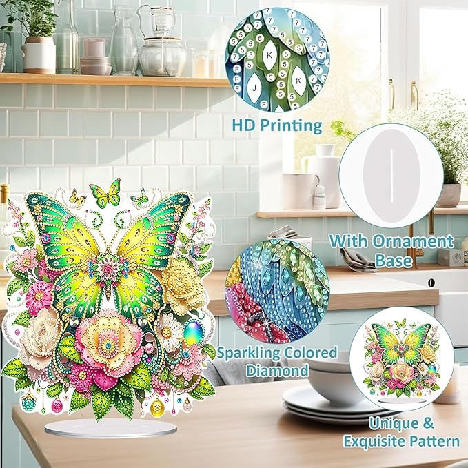 Diamond Painting Kits for Adults Beginners, 5D Full Drill Flowers and Butterfly Crystal Art Desktop Ornament, DIY Single Sided Home Office Desk Decor, Creative Craft Gift Set with Tools