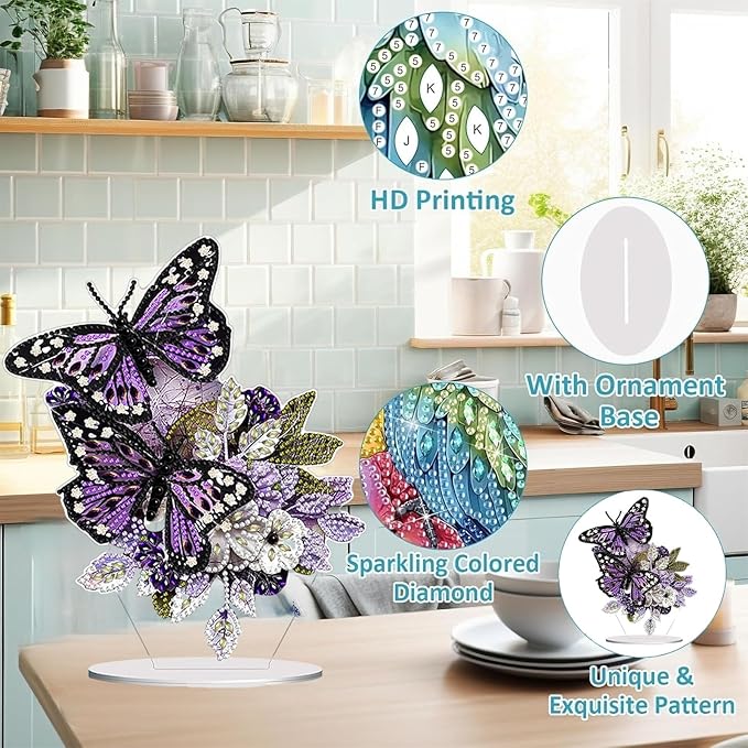 Diamond Painting Kits for Adults Beginners, 5D Full Drill Flowers and Butterfly Crystal Art Desktop Ornament, DIY Single Sided Home Office Desk Decor, Creative Craft Gift Set with Tools