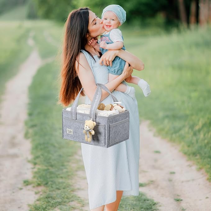 - STYLISH DESIGN AND BONUS TEDDY BEAR CHARM: Crafted with a premium felt exterior, your nursery decor with our neutral diaper organizer. It feels cozy & functional and it looks great on changing table and dresser. The caddy has 8 sturdy outer pockets for ample baby storage and a bonus teddy bear charm, adding a touch of delight