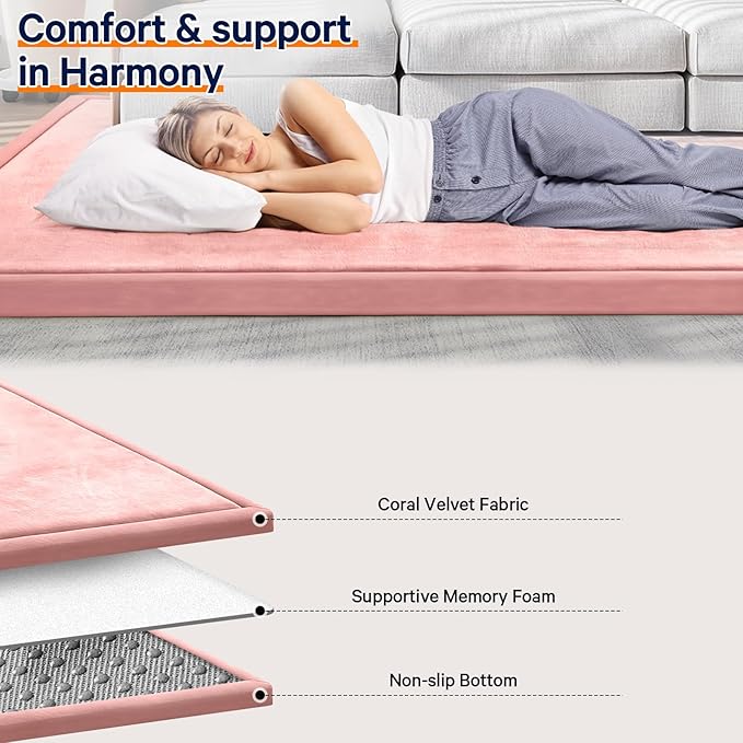 - ๐ฃSAFE & COMFY: Our baby play mat is made of 100% coral velvet material and filled with high-quality 3.5cm thick memory foam,eco-friendly and durable, providing a safe and comfortable play area for your babies, without worrying about them hurting themselves on hard floors.The surface of this tummy time mat is velvet cover, which is not only soft and comfortable to touch, but also has a good cushioning effect.