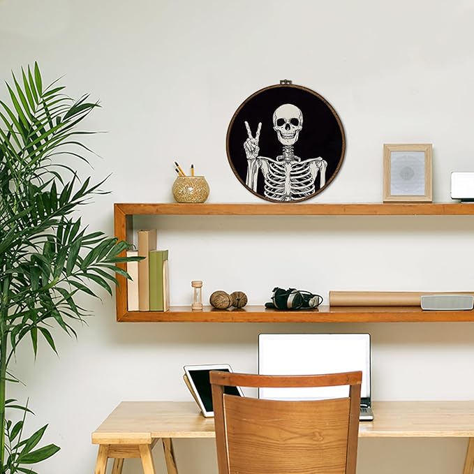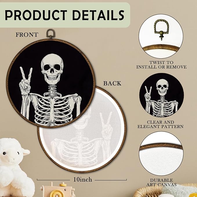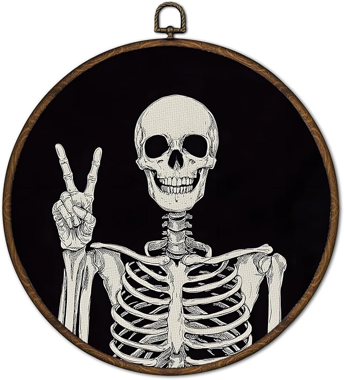 cvjutf Gothic Skeleton Wall Art Decor Framed, Dark Academia Decor, Witchy Halloween Round Wall Decor, Gothic Halloween Skull Canvas Prints Art for Gallery Bathroom Living Room, 10x10 Inch