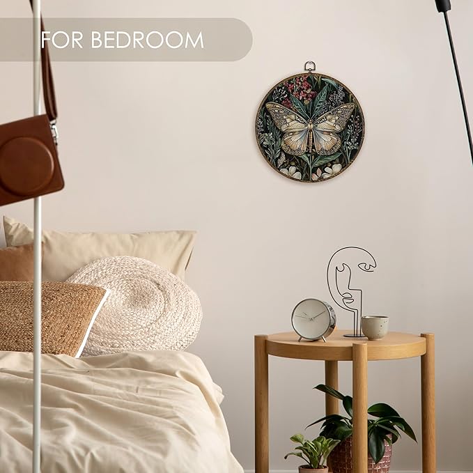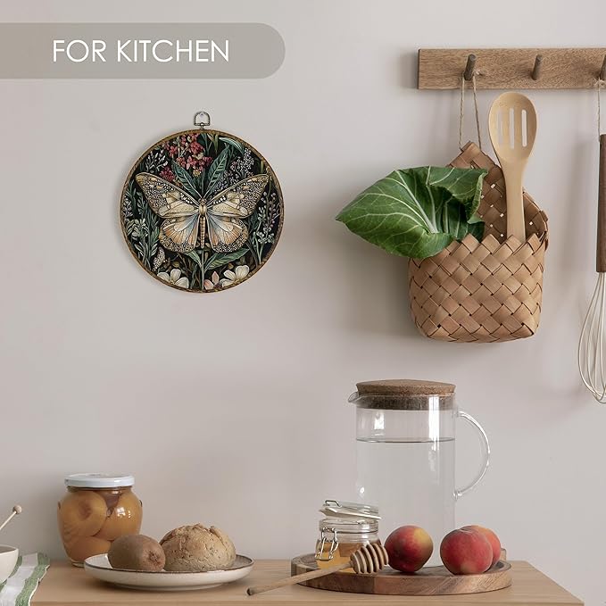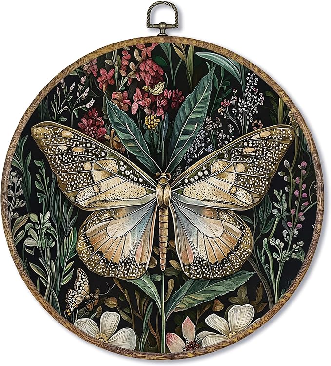 Fewgb Vintage Dark Moody Butterfly Round Wall Art Decor Framed for Bedroom Kitchen, Dark Cottagecore Academia Canvas Wall Art Prints Picture, Gothic Botanical Hanging Room Decor Artwork 10x10