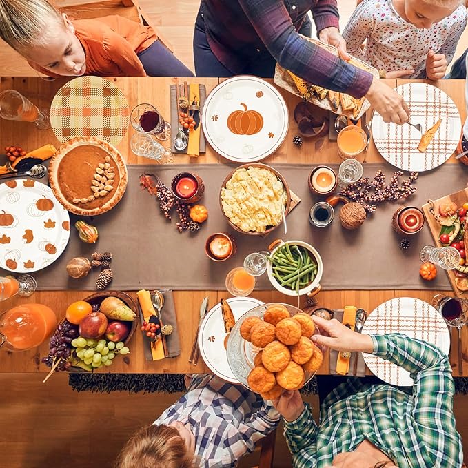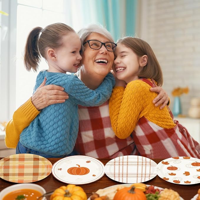 - Fall Designs: Two of our paper plates feature fall elements such as pumpkins and maple leaves, while the other two are orange and brown gingham plates. Add a rich fall atmosphere to your party.