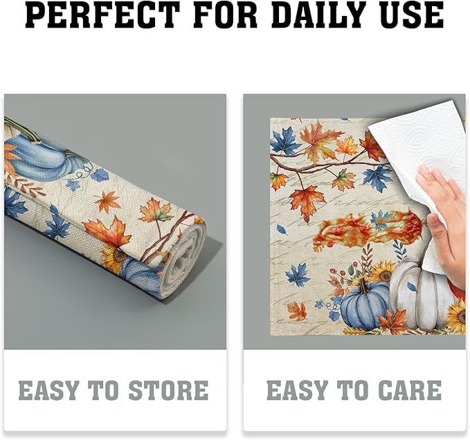 - Easy Care: Autumn placemats can be washed by hand or machine, or wiped clean with a damp cloth. If there are stains on placemats, give them a quick wash and you can use them again, effectively extending the life of your dining table