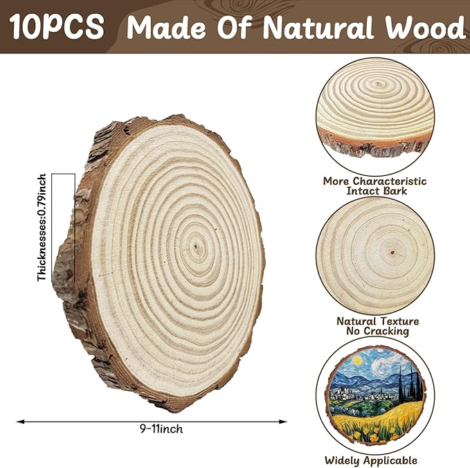 - Natural Wood Slices: This set includes 10pcs 9-11 inch round wood slices,each approximately 0.79 inches thick.Each piece is hand-selected,with their own grain and shape,polished smooth,ready to Use.Perfect for creating rustic table centerpieces and a variety of DIY projects
