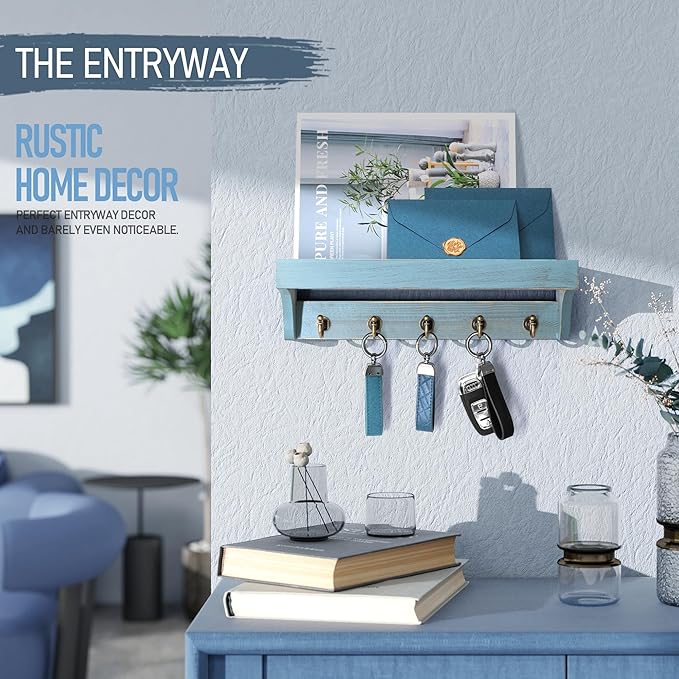 - [UPGRADED BRIGHT HOOKS] Sturdy and fashion Room Decor Key Organizer Wall Mount, with bright key hooks enhance the fashion of our key and mail holder for wall. Five decorative hooks on a modern blue key hanger hold dog leashes, purse, jackets and more.