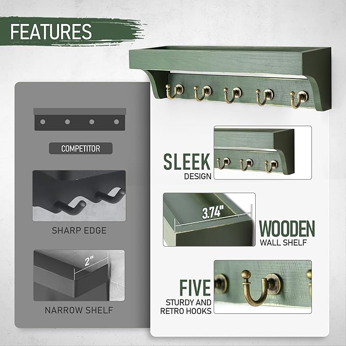 - [14" WIDE ORGANIZER] Crafted in distressed green, this floating shelf with 5 heavy-duty hooks maximizes small-space storage. Organize daily home essentials — keys, mail, glasses, leashes—alongside memories (photos, souvenirs) in one rustic-chic hub.