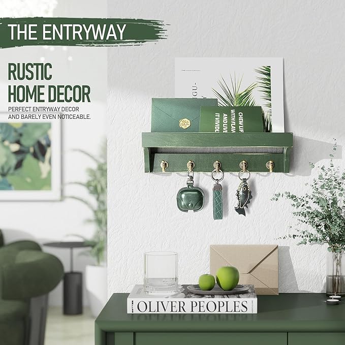 - [UPGRADED KEY HOOKS] This sturdy and stylish green key organizer wall mount features command hooks that elevate the look of your key and mail holder for wall. With five decorative hooks on a green key hanger, it's perfect for holding dog leashes, purses, jackets, and more!