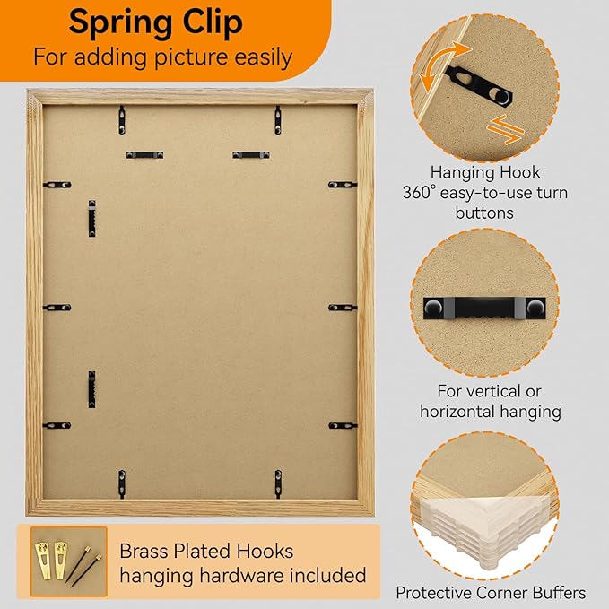 - VERSATILE DISPLAY: Sturdy backboard and versatile hooks allow for horizontal or vertical placement,it creates a cozy atmosphere. Our natural oak poster frames to display your pictures, posters, diplomas and crafts for a stylish home decor.
