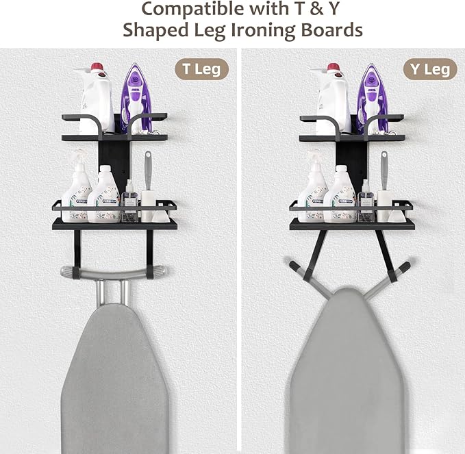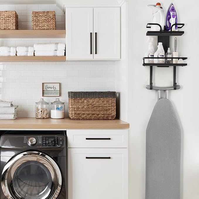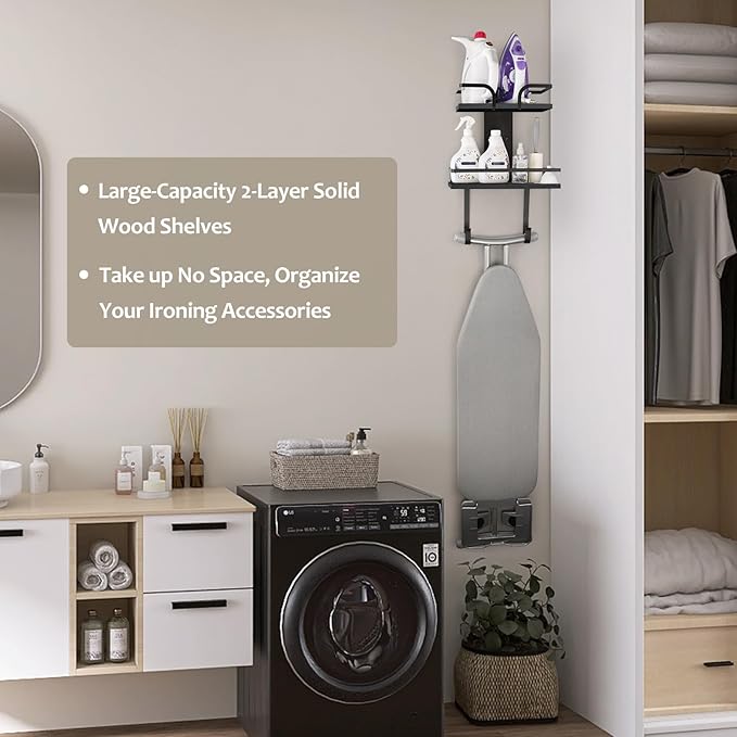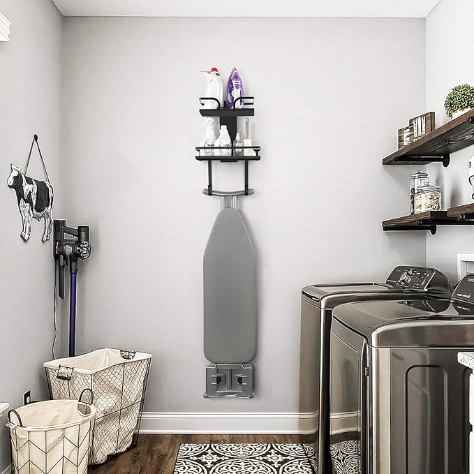 - 【Functional & Versatile】 Apart from the ironing board and the iron, you can store various types of items on the shelves. This holder is also suitable for utility room, sewing room, bathroom, kitchen, or bedroom to keep everyday stuff organized and accessible.